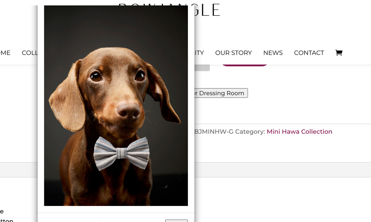 Once you have chosen a bow tie, please enter our Dressing Room to see what the bow tie looks like on your dog. This will assist you in choosing any tie from our collections.
